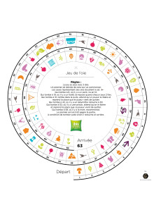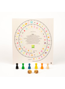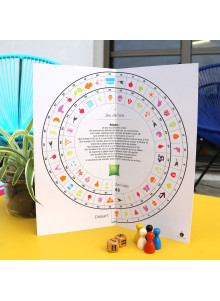- Plateau de jeu en papier recyclé, format 210*210mm plié en deux. Les cases bonus 'oie' peuvent être personnalisées avec un logo couleur