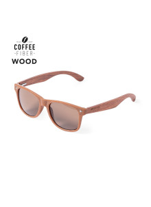 Lunettes de soleil Publicitaire l de la ligne Nature avec protection UV 400. Monture en fibre de café et branches en bois naturel assorties, avec des verres de couleur marron. Fibre de café distinctive injectée dans le moule de la branche gauche.